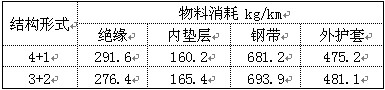 由于其導體用量都是一樣的,并且通過其電氣性能和機械性能試驗都是合格的。只在成纜外徑上面有差別,所以其物料消耗體現在絕緣、內墊層、鎧裝和護套上面。通過生產統計我們得出表1,4瓦形+1圓形的這種結構在絕緣上面用的絕緣料稍多些,不過由于其成纜外徑比較小,對內墊層、鋼帶及外護套的消耗有所減少。