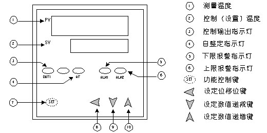 1、 測量溫度顯示屏:(PV)在正常工作時,顯示測量溫度值;在進行參數(shù)設(shè)置時,顯示提示符;