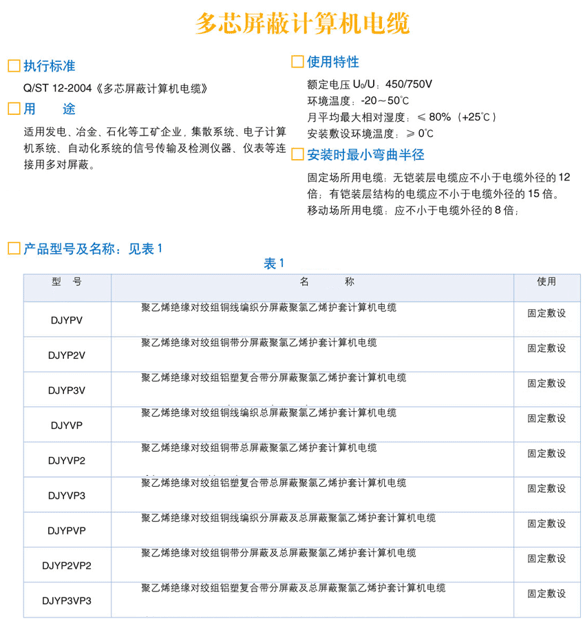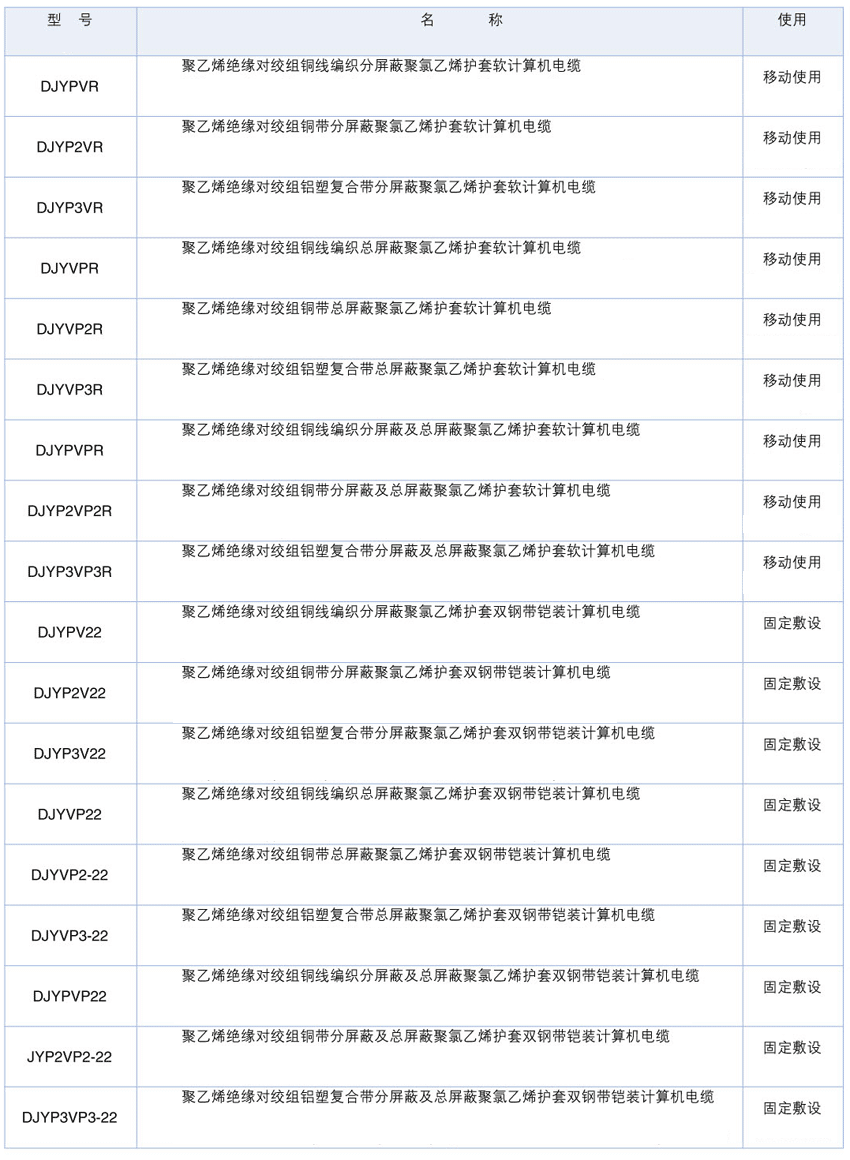 DJY多芯屏蔽計算機電纜產品型號名稱